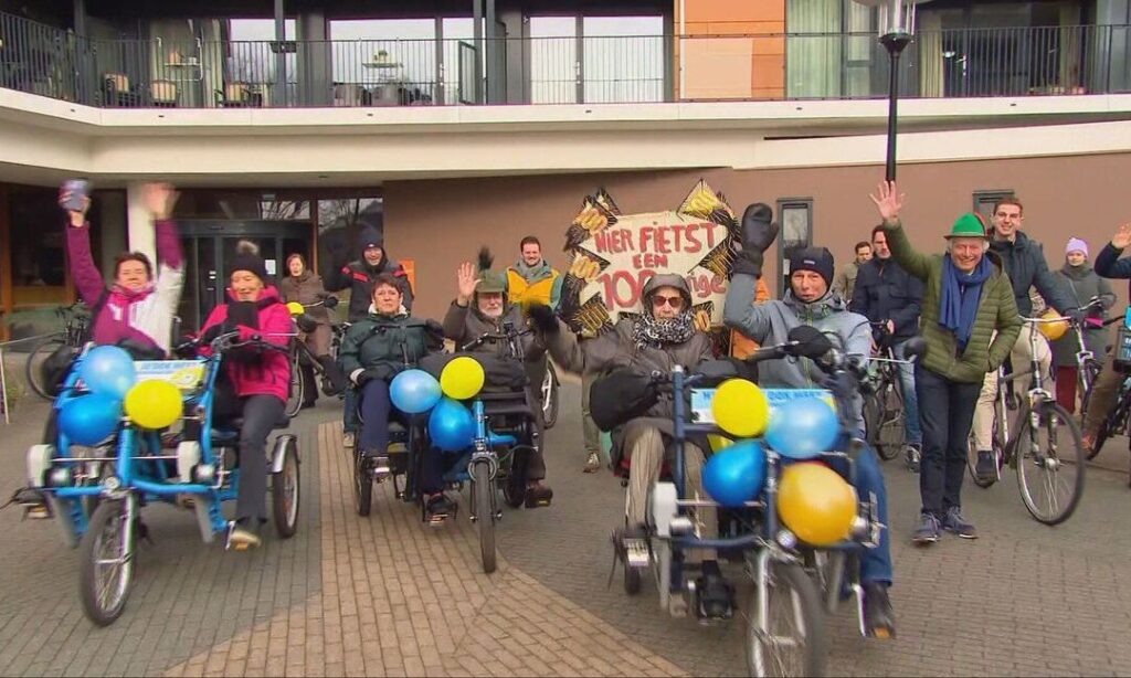 Dé Schalkoord vierde haar 100ste verjaardag met een fietstocht samen met haar fietsmaatje Geert en familie. Ze fietsen al drie jaar met veel plezier samen — leeftijd is geen beperking voor genieten op de duofiets!